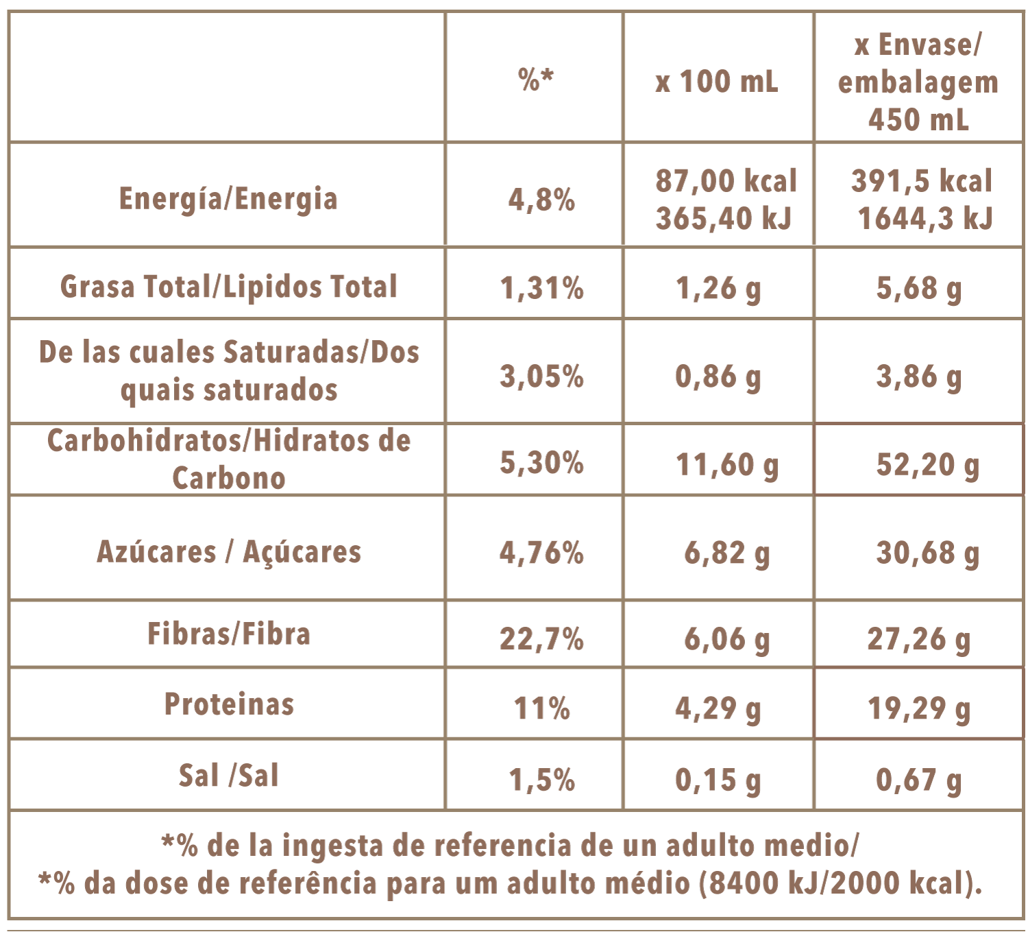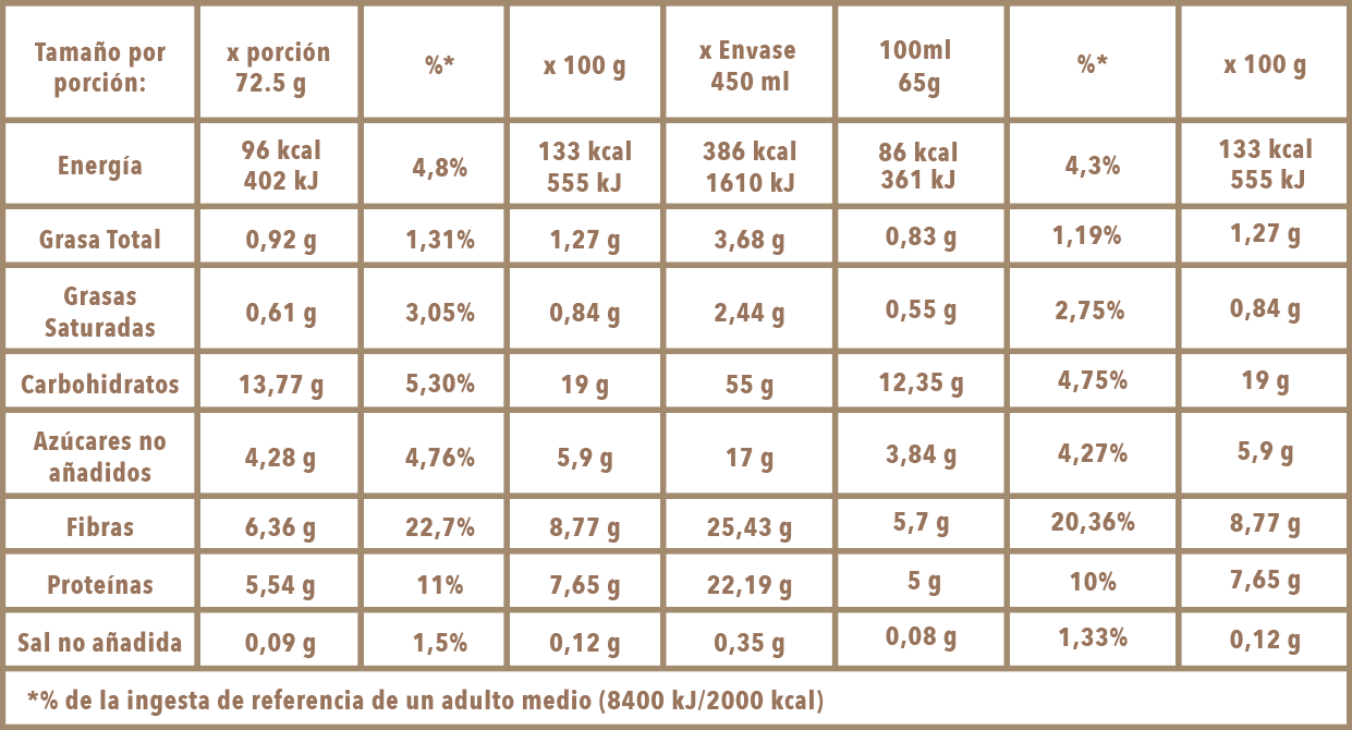 Leche desnatada rehidratada deslactosada, polvo de cacao: 8%, inulina (fibra natural prebiótica), maltodextrina 6, edulcorantes (sorbitol E420, stevia (E960 glucósidos de esteviol), proteína de leche aislada rehidratada y deslactosada, lactasa, emulgente: (monoglicéridos de ácidos grasos E471), estabilizates (goma xantana E415, goma de celulosa E466).